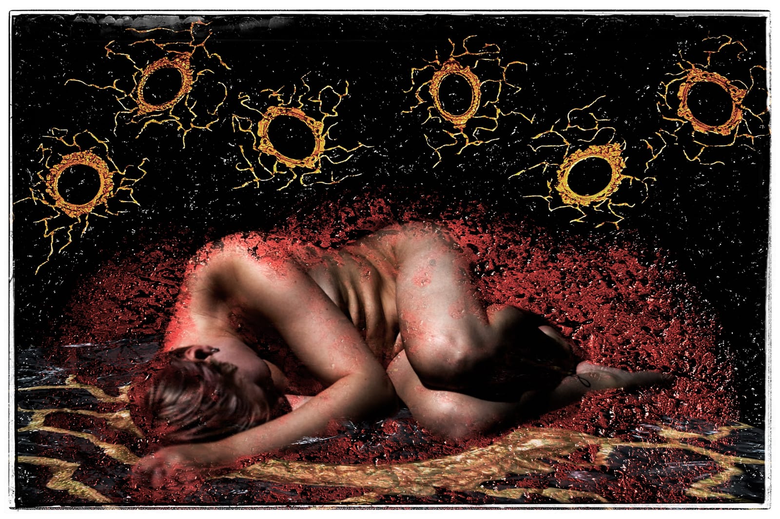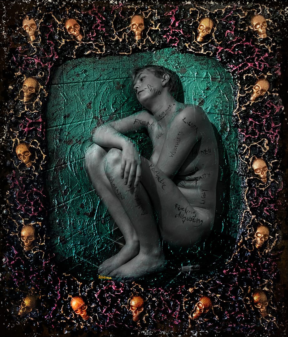 I vårat senaste projekt bearbetar vi relationen till den egna kroppen. Det är många som lever med ett kroppshat och ett kropssförakt och som känner att samhällets ramar gör att man inte passar in. Det här kan skapa både olust, skam och djup ångest med självskador som följd. Fokus borde ligga på hur fantastisk våra kroppar är oavsett utseendet. Vi andas, går, bygger, lyfter, fortplantar oss, ser, hör, upplever livet, för att inte tala om hur fint kroppar samspelar i allt från en varm kram till att njuta på egen hand eller med någon annan. Det är lättare sagt än gjort när kommentarer haglar på sociala medier, när produkter använder stereotypa personer och när fotografer, journalister och andra inom media retuscherar och ändrar utseenden och när personliga åsikter misstas för sanningar. Då är det lätt att mörkret kryper närmare, att osäkerheten på om man duger tar över och man distanserar sig först från omvärlden och till slut från sig själv. Det mörka, svarta och djupa tar över och det röda hatet glöder i din hud, i dina former, eller där de gröna, giftiga och hatiska kommentarerna fräter hål i din själ och i det som är du. Det är utgångspunkten i våra två nya bilder ”Made up minds” och ”Frames”.