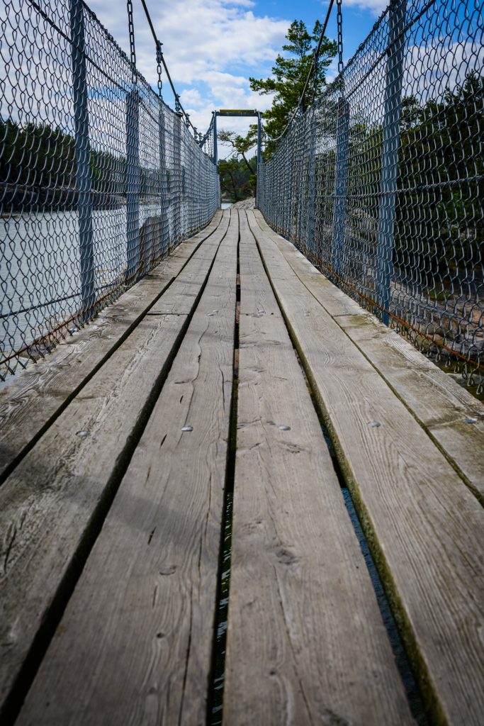 För att komma ut på ön behöver man bara följa den märkta rutten och mellan skären och småöarna ligger det spångar som utan problem klarar 300kg åt gången. Det är inte särskilt högt upp men att gå på en spång som gungar lite lätt över havet känns ändå spännande på nått vis.