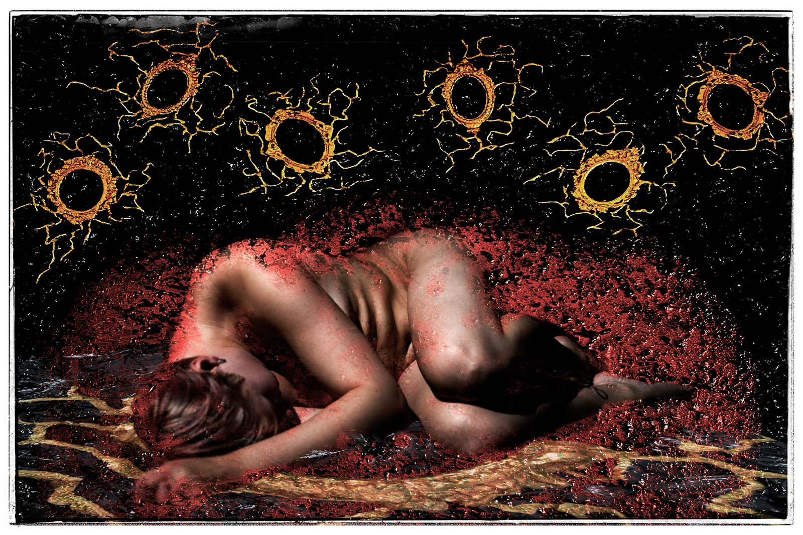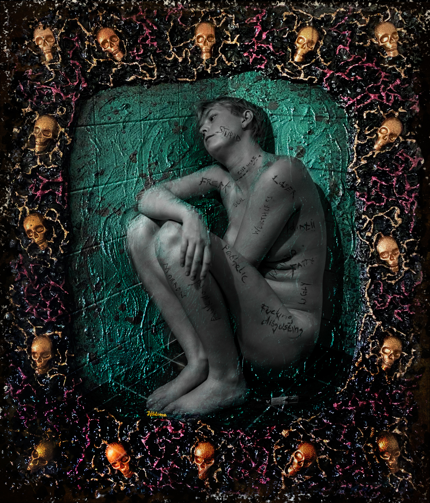 Det är lättare sagt än gjort när kommentarer haglar på sociala medier, när produkter använder stereotypa personer och när fotografer, journalister och andra inom media retuscherar och ändrar utseenden och när personliga åsikter misstas för sanningar. Då är det lätt att mörkret kryper närmare, att osäkerheten på om man duger tar över och man distanserar sig först från omvärlden och till slut från sig själv. Det mörka, svarta och djupa tar över och det röda hatet glöder i din hud, i dina former, eller där de gröna, giftiga och hatiska kommentarerna fräter hål i din själ och i det som är du. Det är utgångspunkten i våra två nya bilder ”Made up minds” och ”Frames”.